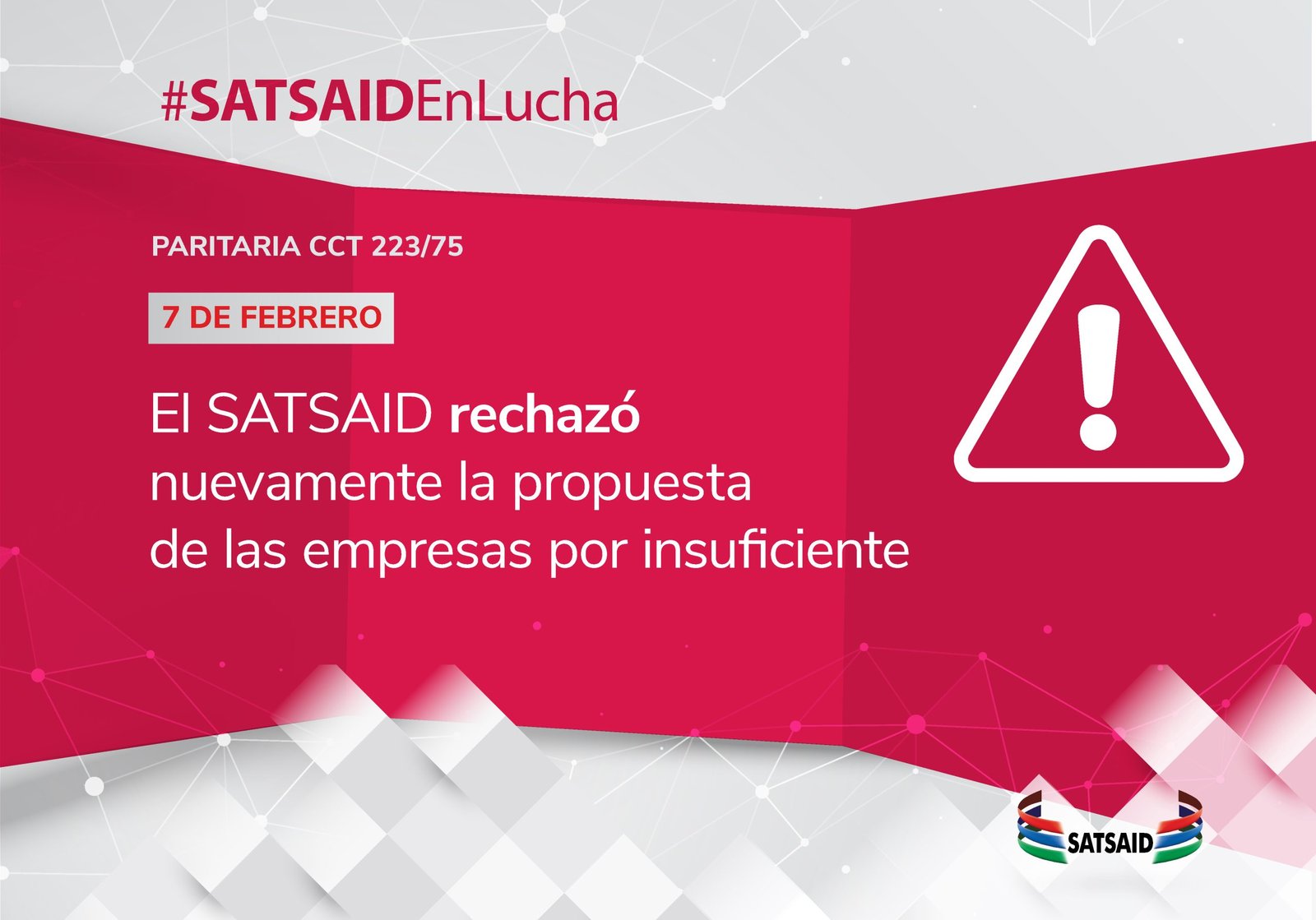 Ante esta situación, el SATSAID reafirmó su solicitud salarial y exigió al sector empresario que atienda esta situación con la seriedad y urgencia que amerita la necesidad de mantener el poder adquisitivo del salario ante la grave situación económica y los altos índices inflacionarios que atraviesa nuestro país.