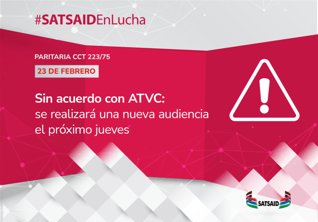 Sin llegar a un acuerdo entre las partes, la Secretaría de Trabajo convocó a una nueva audiencia el próximo jueves 29 de febrero a las 10hs. El SATSAID dará continuidad, en caso de no llegar a un entendimiento en los próximos días, a su campaña de difusión realizando una manifestación pública de sus demandas salariales.